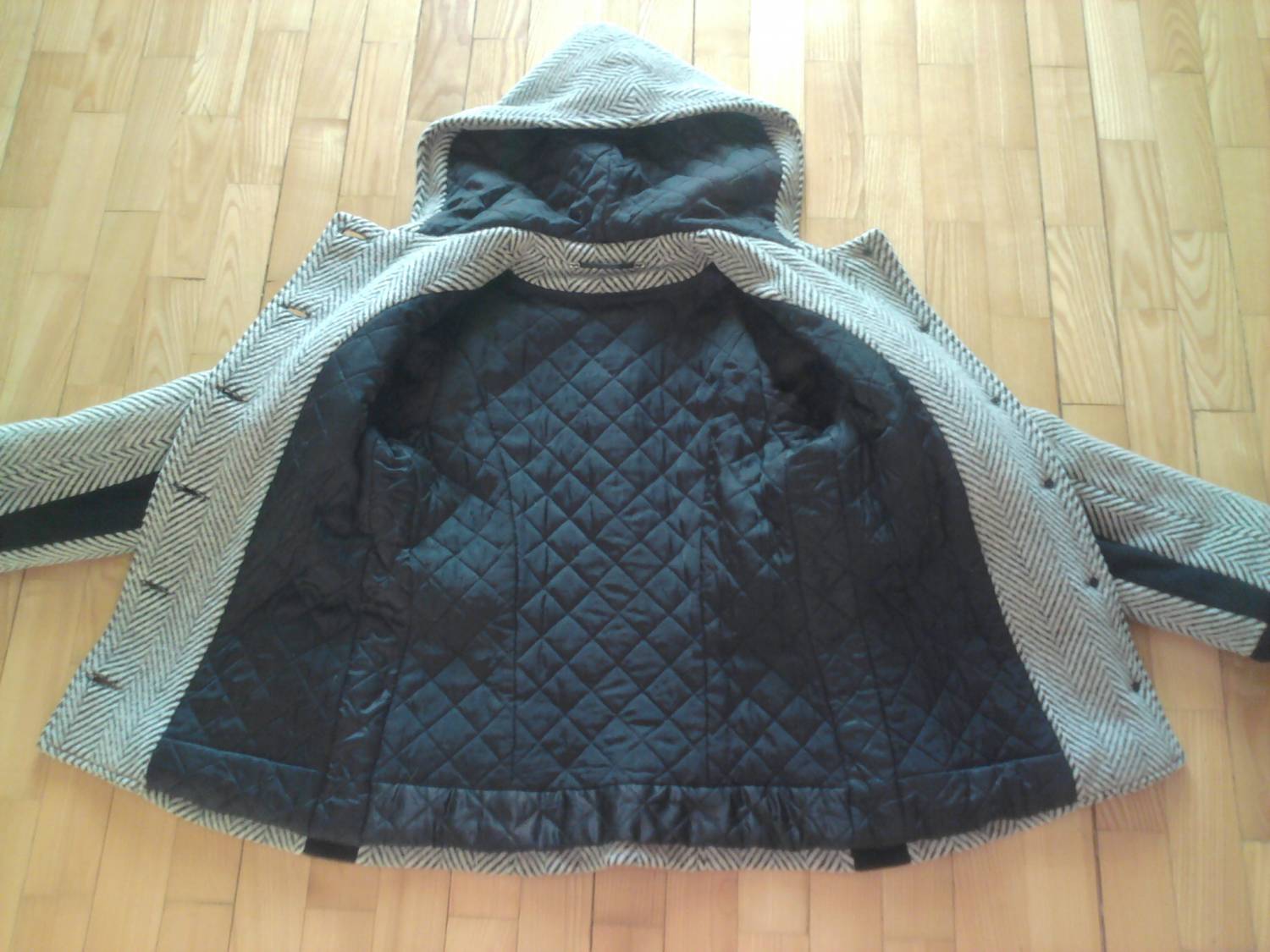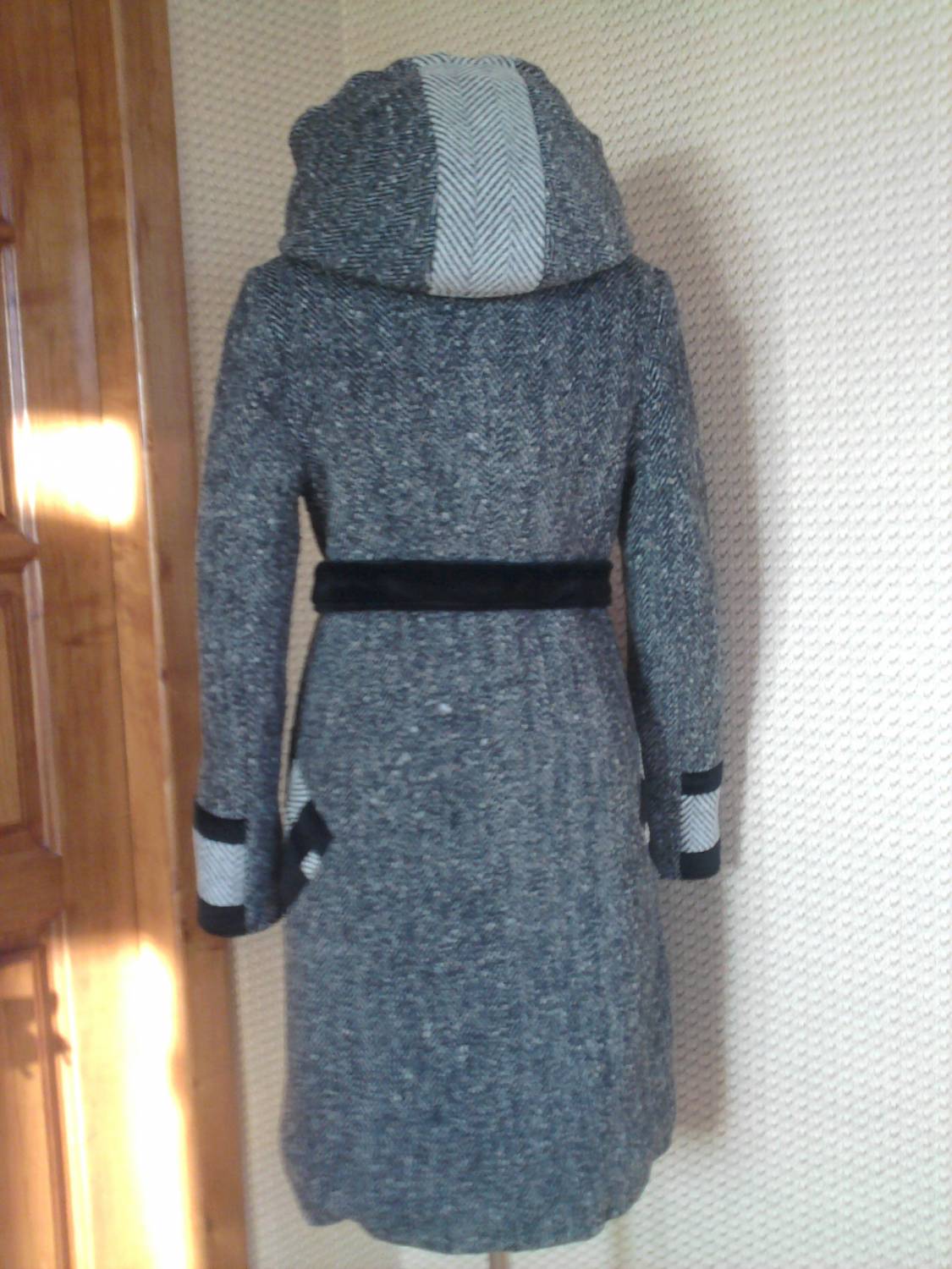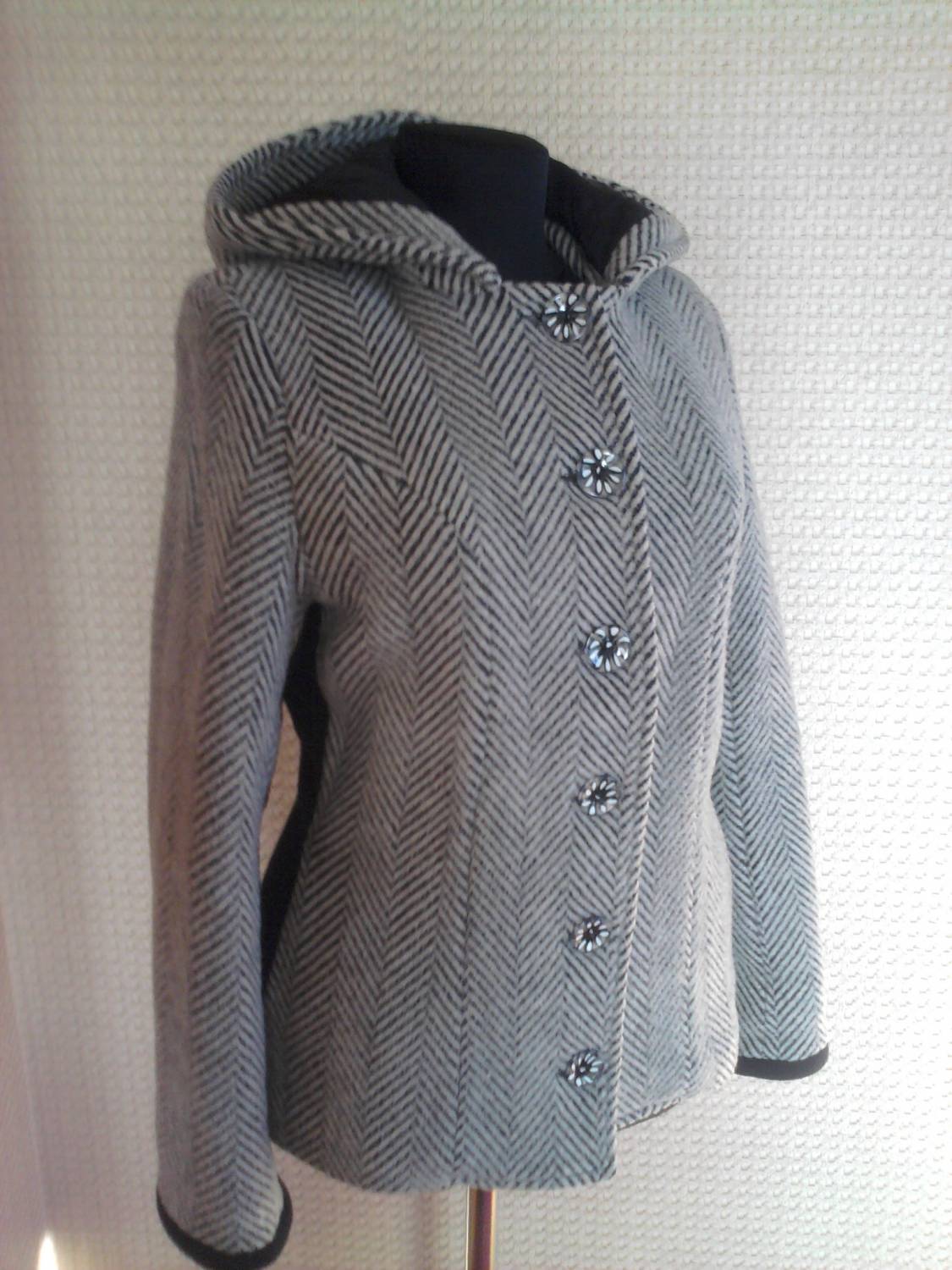 Пальто зимнее короткое, 44 р. Силуэт приталенный, с боковыми карманами, капюшоном, застежка на пуговицы. Есть вставки из черной пальтовой ткани по бокам, по низу и внутренней стороне рукава. Подкладка с утеплителем (шерстепон). Цена: грн. ПРОДАНО Детальное фото прилагается - [i] [i] [i] [i]