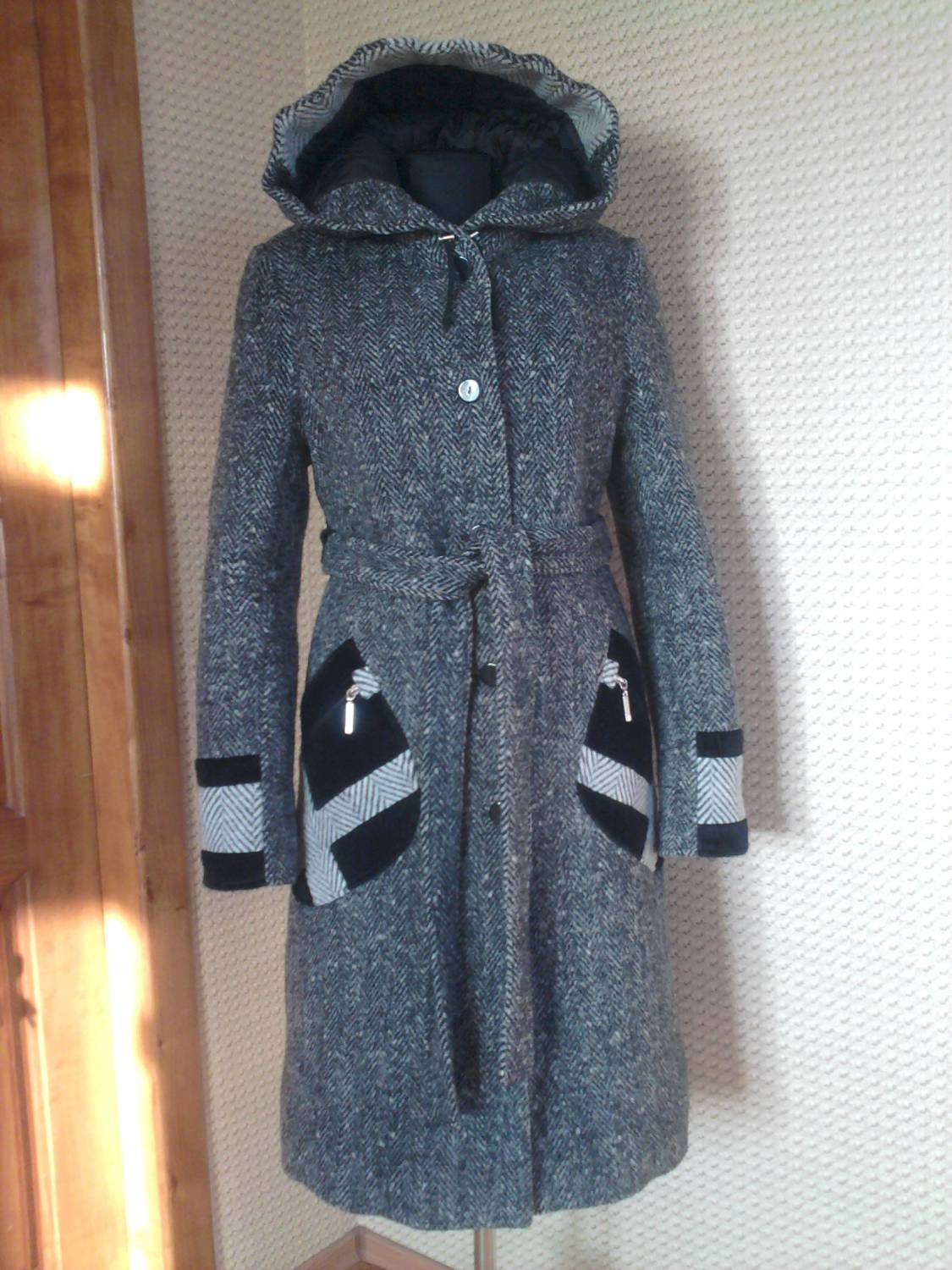 Пальто зимнее чуть ниже колен 44р. на рост 165 - 170. Силуэт приталенный, есть пояс, капюшон, глубокие карманы. Вставки по рукавам, карманам и капюшоне. Застежка на пуговицы. Подкладка очень теплая (шерстепон + подкладка стеганная синтапоном ) на холодную зиму. Цена: грн. ПРОДАНО Детальное фото прилагается - [i] [i] [i]
