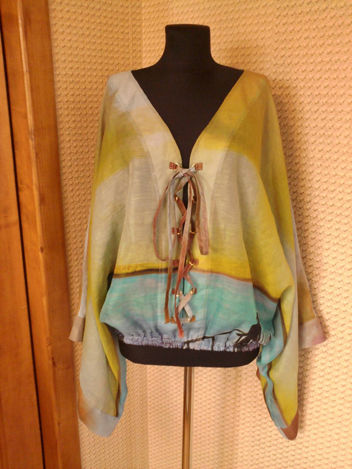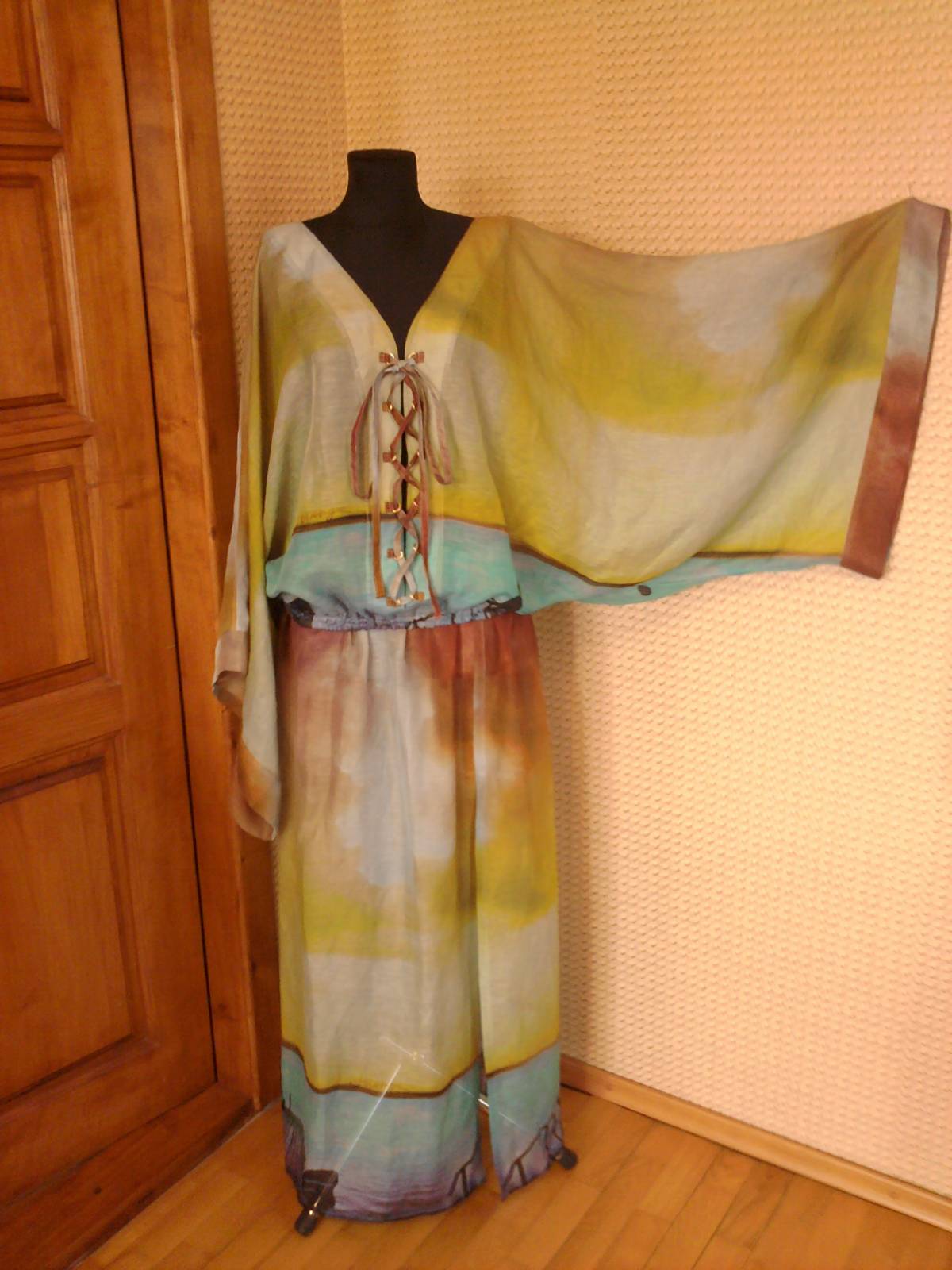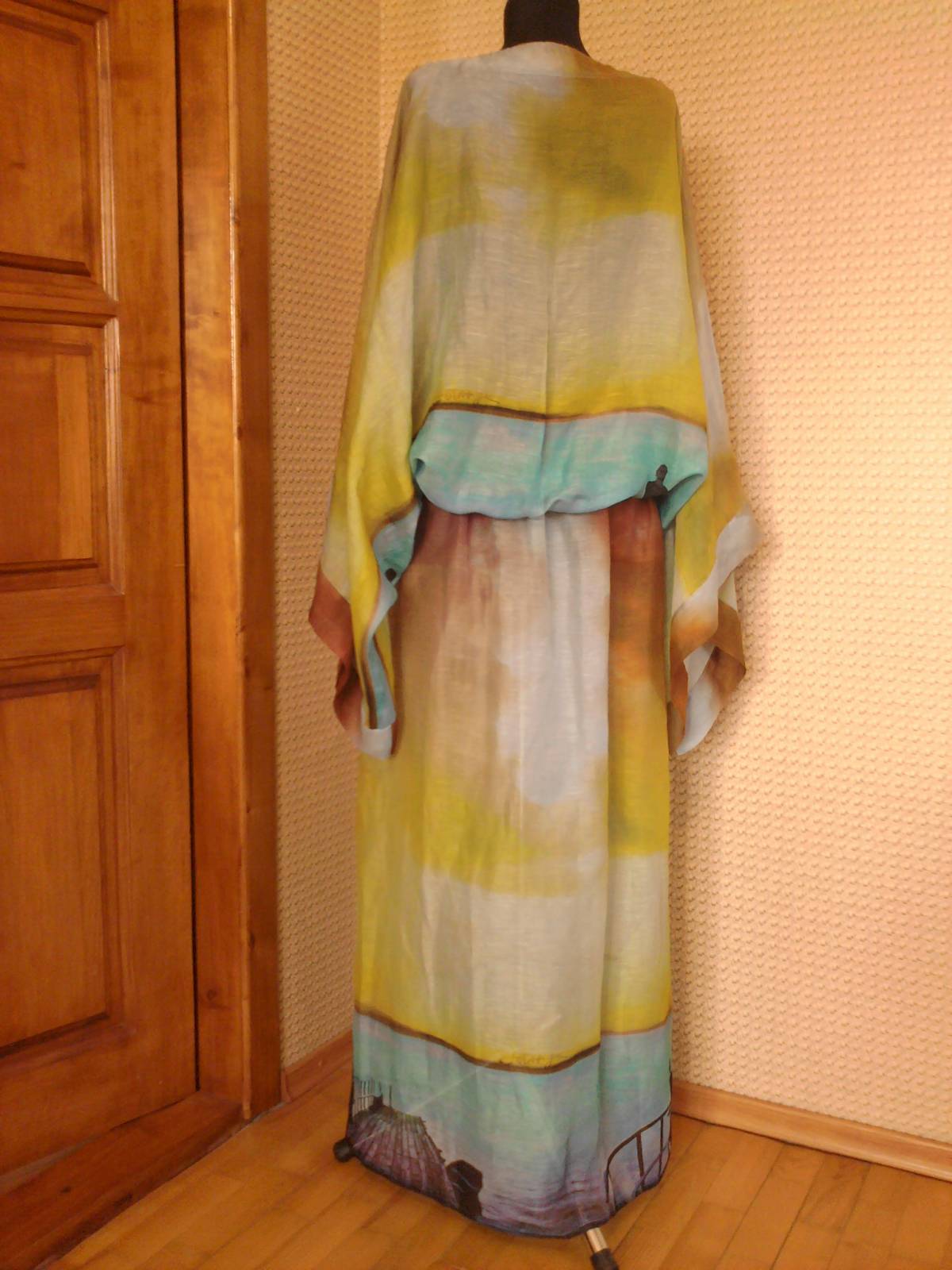 Костюм пляжный. Ткань: лен. Силуэт свободный, рукава Т - образные. Юбка прямая с разрезом.