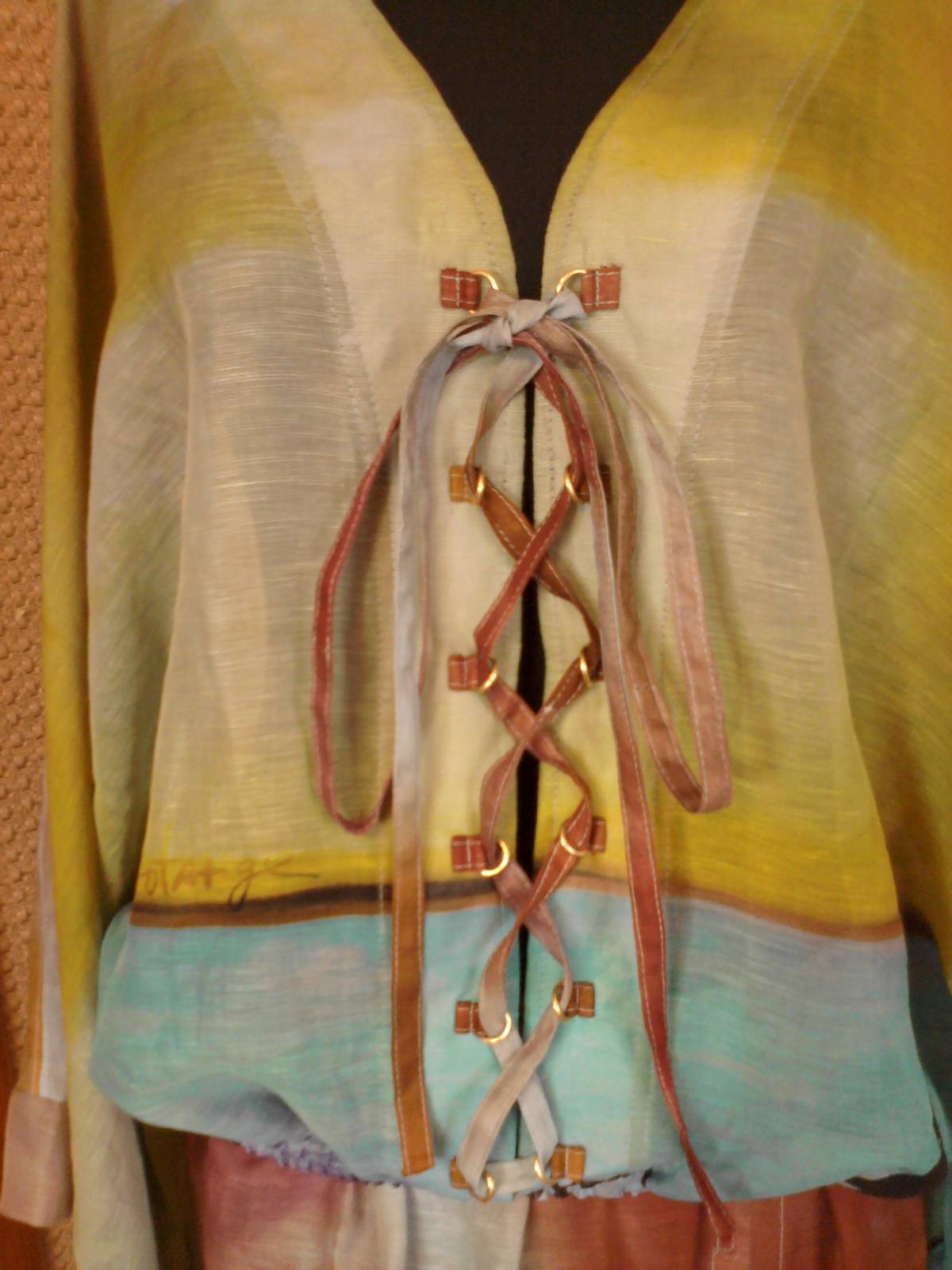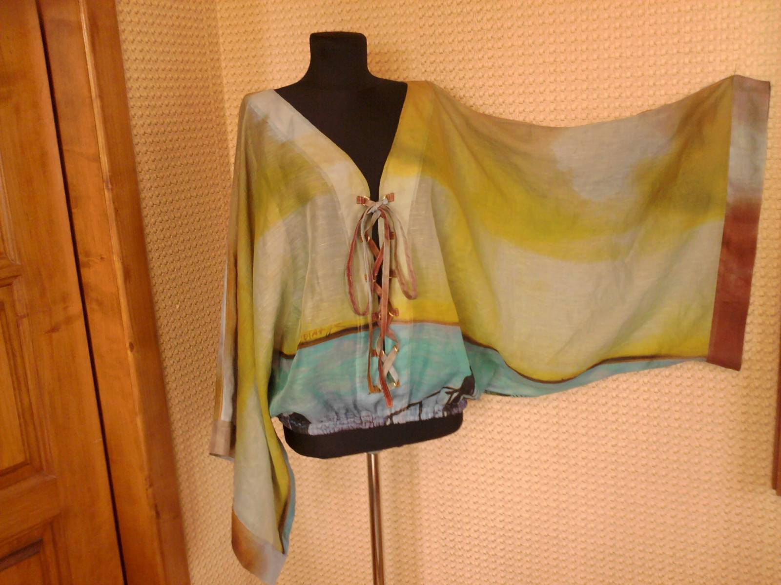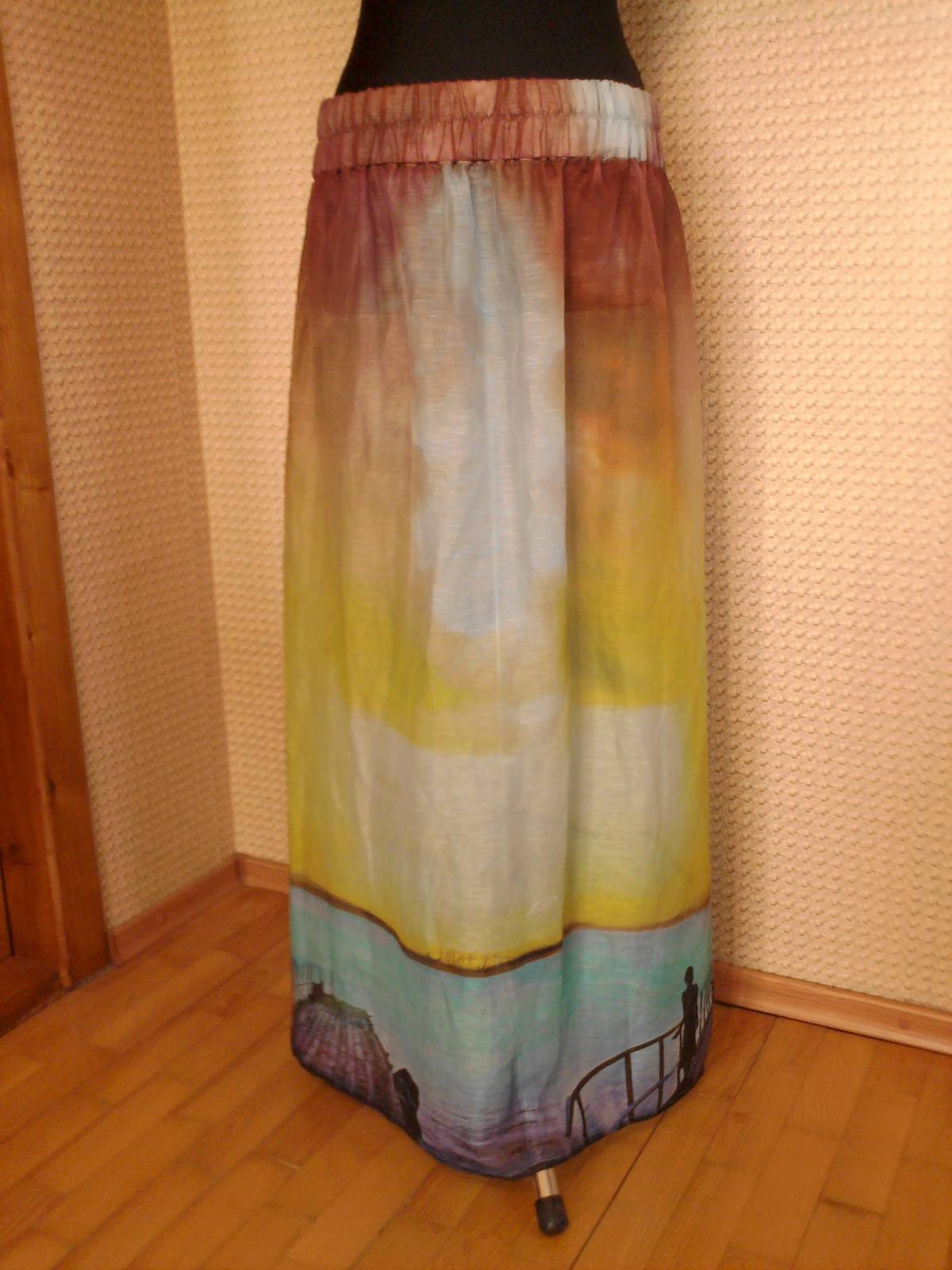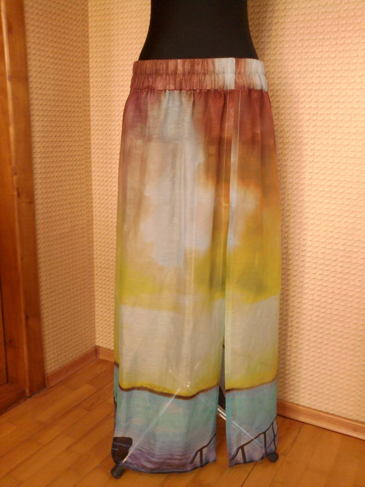 Костюм пляжный. Ткань: лен. Силуэт свободный, рукава Т - образные. Юбка прямая с разрезом.