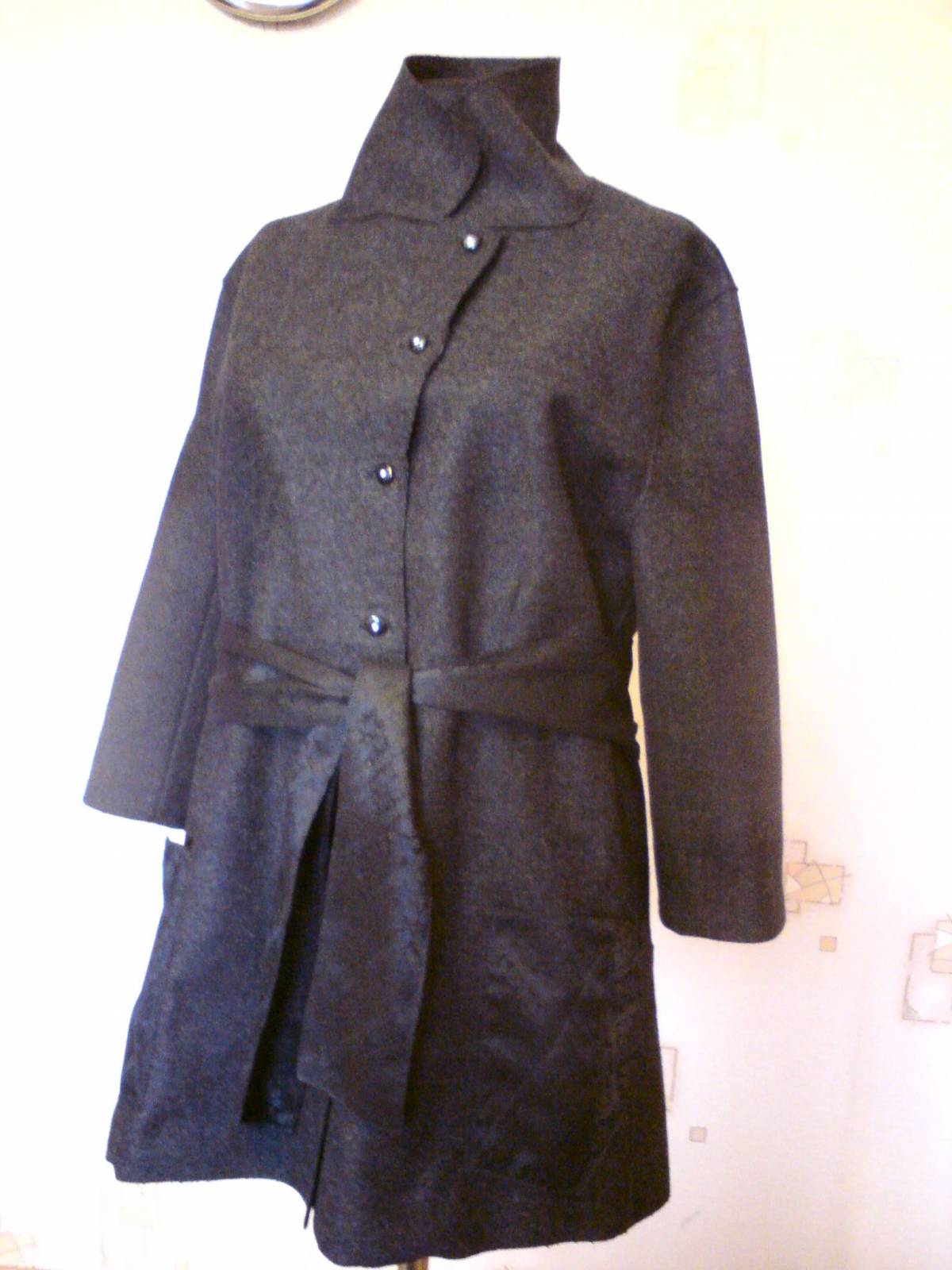 Полуприталенный силуэт. Воротник можно застегнуть как лацкан и доверху. Рукав в тричетверти. Пояс (фиксируется сзади)...