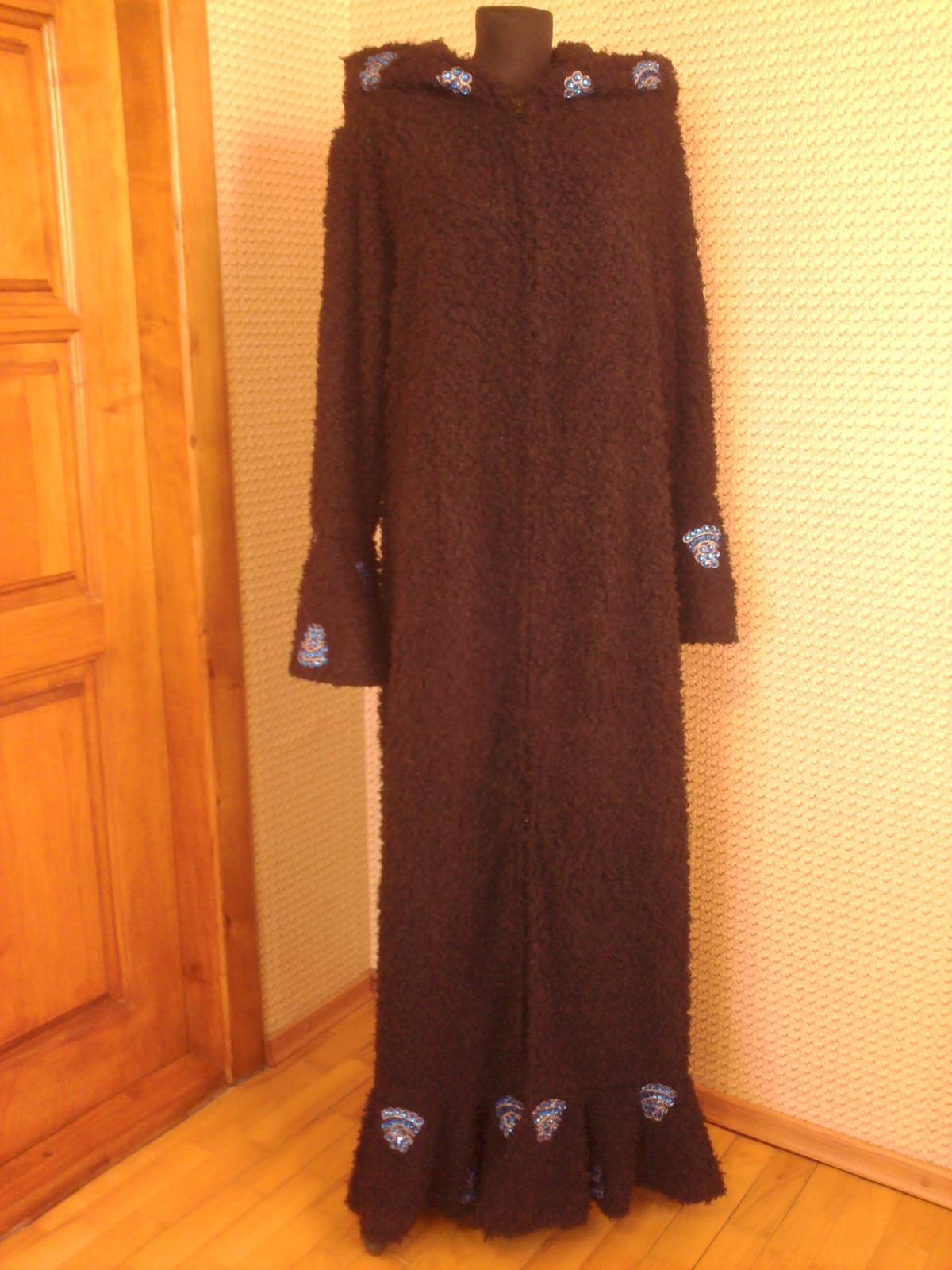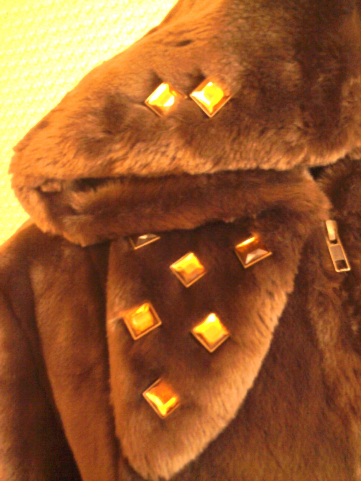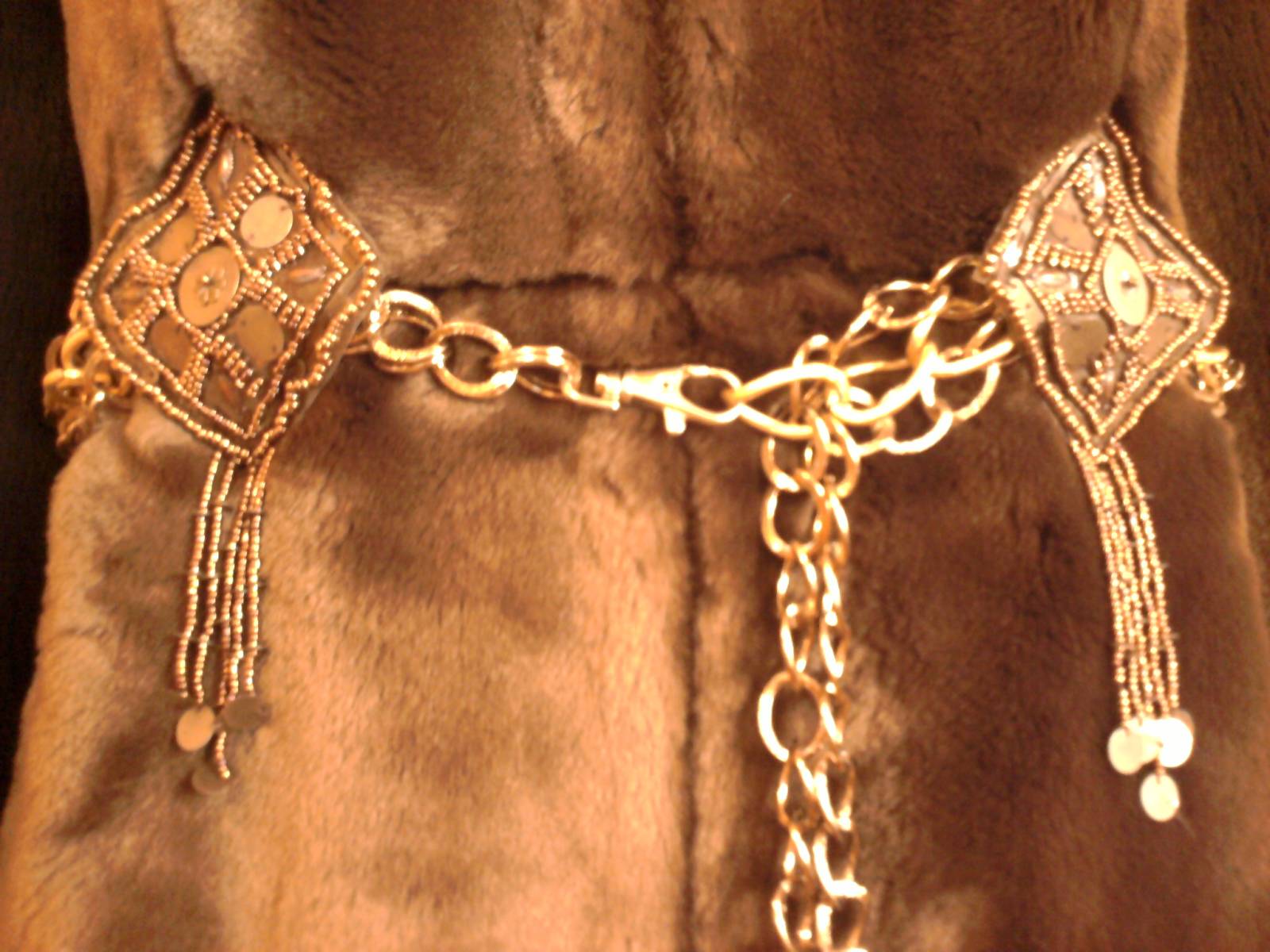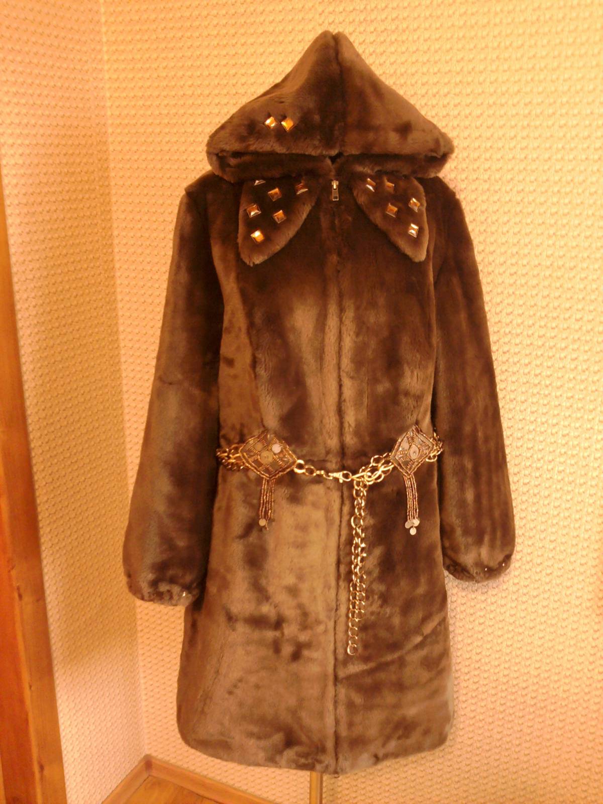 Шуба искусственная. Пояс из цепей, хлястики из бисера.