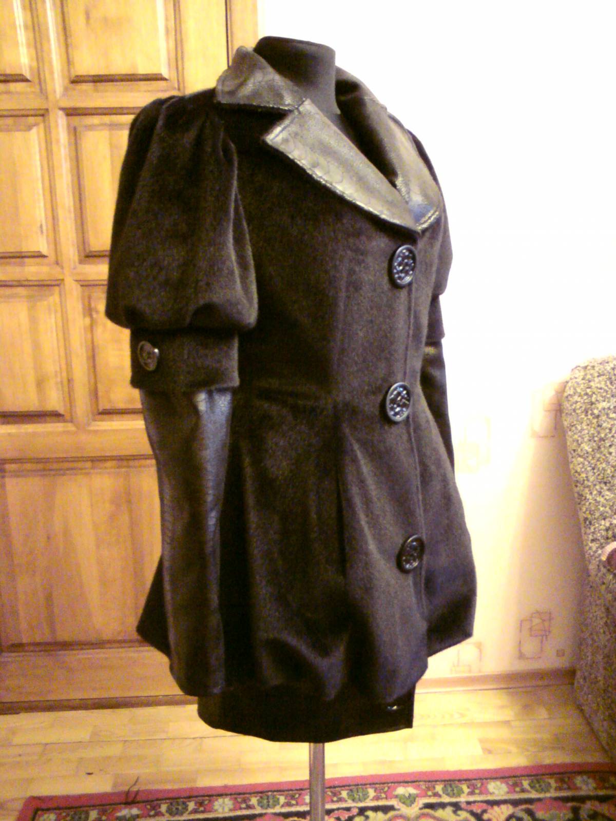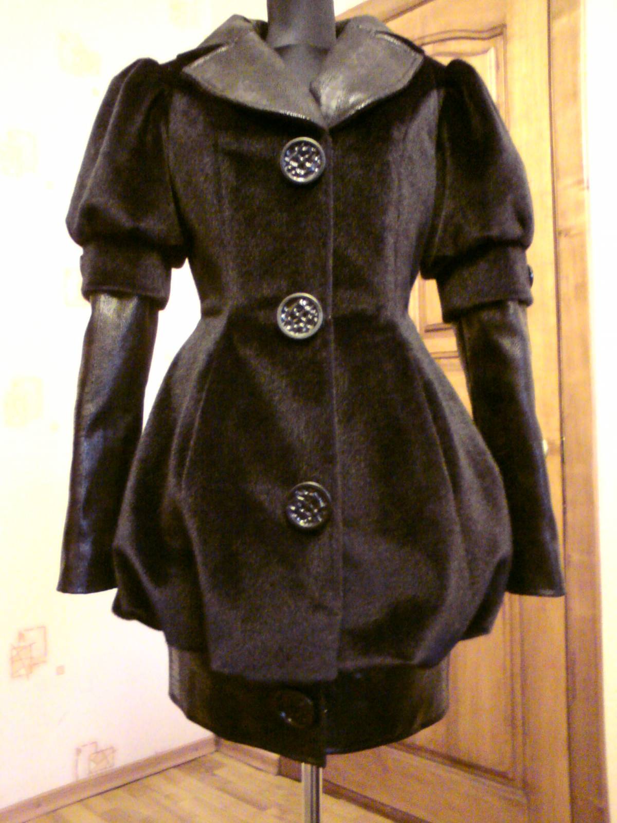 Воротник отложной с лацканами из кожзама "змейка".Рукав фонарик на манжете, с продолжением в виде трубы. Низ собран н...
