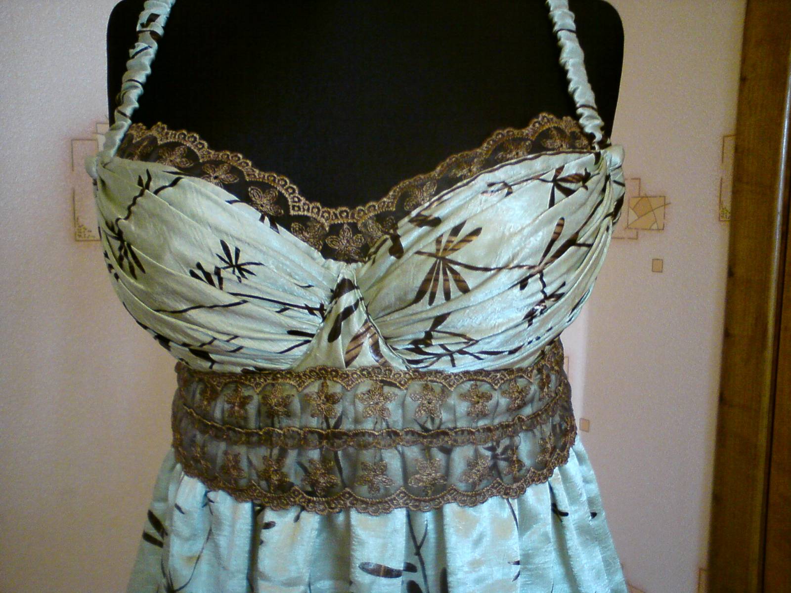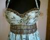 Лиф обшит основной тканью по косой, с добавлением кружевной тесьмы. Бретели присобраны на резинку.