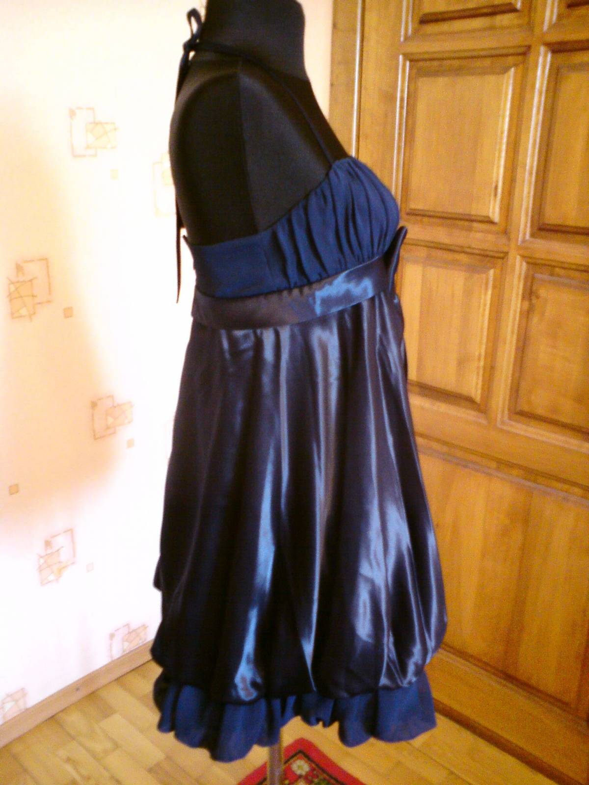 Низ платья не ровный: спереди короче, сзади длиннее.