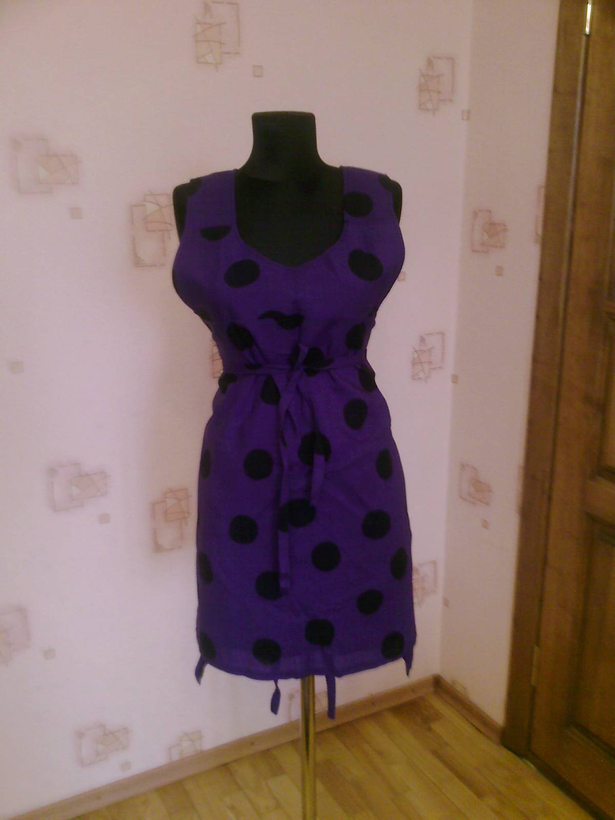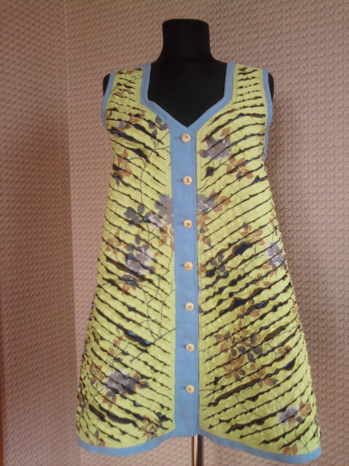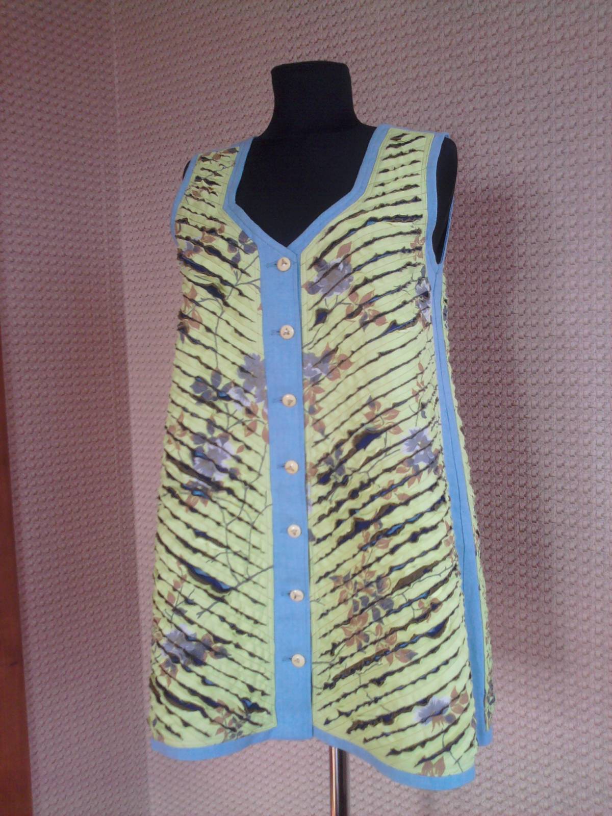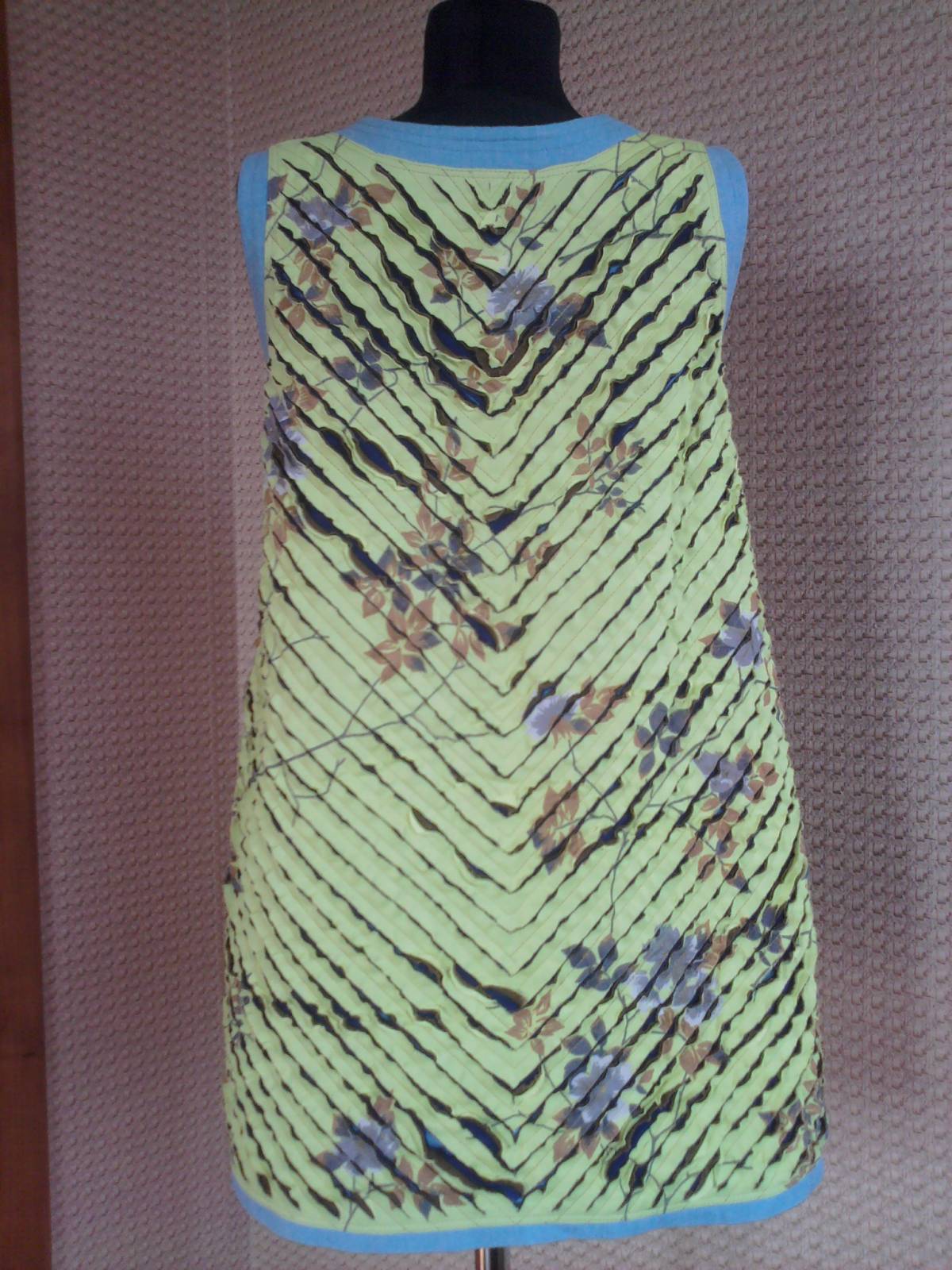 Туника "синель". Ткань: голубой креп, цветной-желтый ситец, фиолетовый иск.шелк, тем.зеленая х/б. Силуэт трапеция.