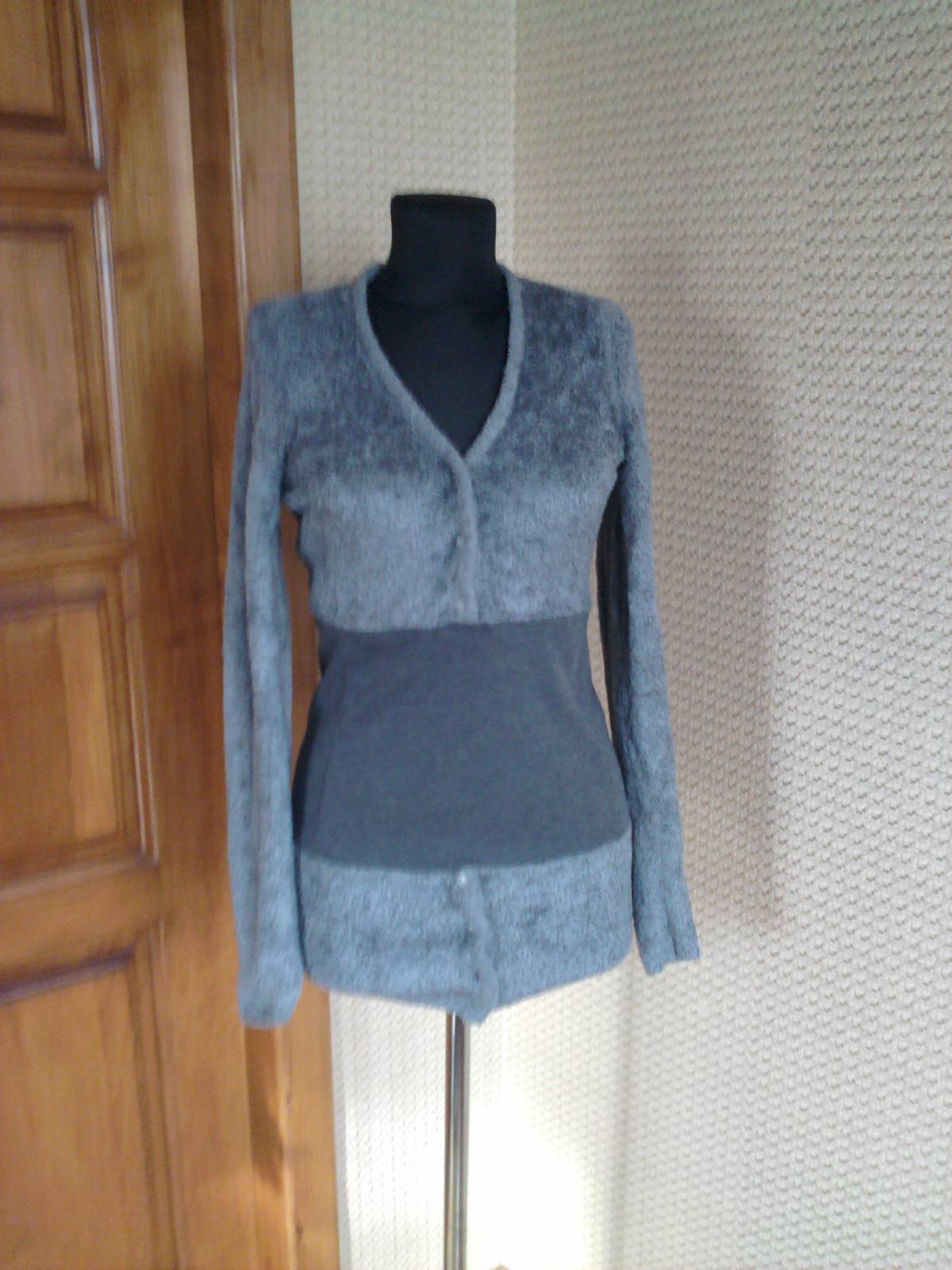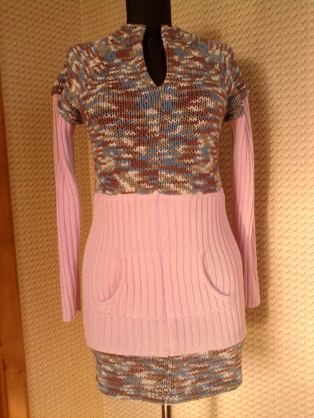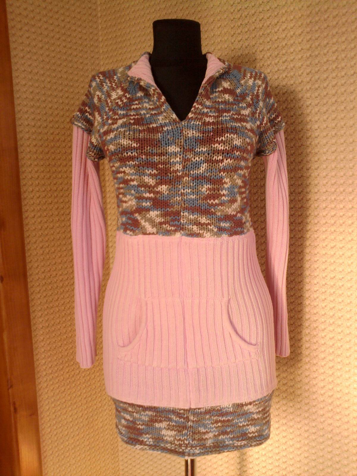 Туника вязанная. Это переделка из вязанного реглана с карманами и жилета. Интересное сочетание. Воротник отворачивается.